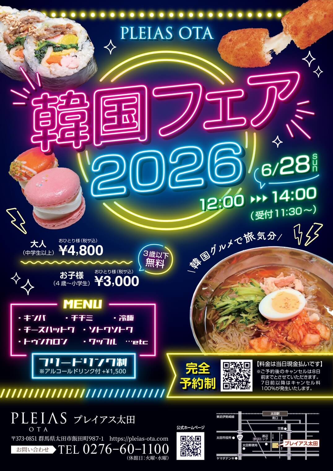 キンパ / チーズハットグ / トゥンカロン / チヂミ / ソトクソトク / 冷麺 / ワッフル など